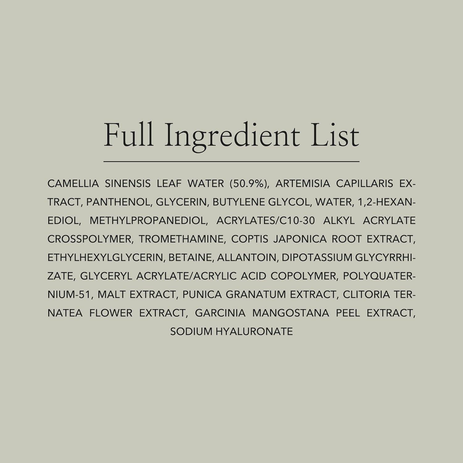 Camellia Sinensis Leaf Water (50.9%), Artemisia Capillaris Extract, Panthenol, Glycerin, Butylene Glycol, Water, 1,2-hexanediol, Methylpropanediol, Acrylates/C10-30 Alkyl Acrylate Crosspolymer, Tromethamine, Coptis Japonica Root Extract, Ethylhexylglycerin, Betaine, Allantoin, Dipotassium Glycyrrhizate, Glyceryl Acrylate/Acrylic Acid Copolymer, Polyquaternium-51, Malt Extract, Punica Granatum Extract, Clitoria Ternatea Flower Extract, Garcinia Mangostana Peel Extract, Sodium Hyaluronate
