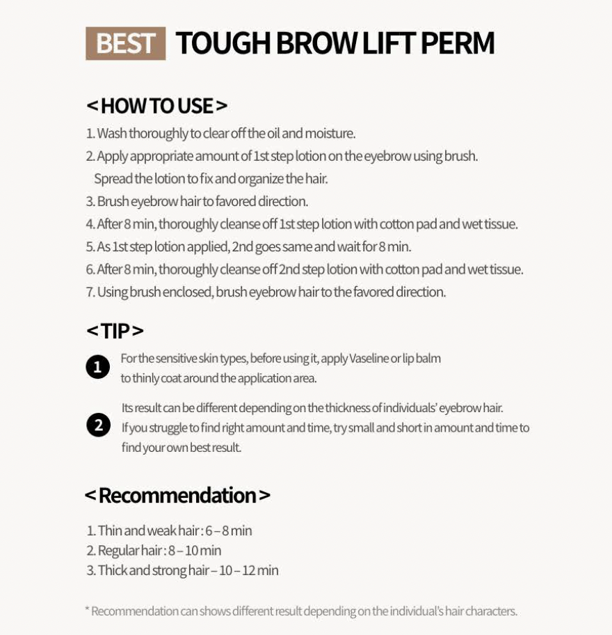 A. Tough Brow Lift Perm is certified for low irritation in skin irritation tests. However, depending on individual skin characteristics, there may be allergic/sensitive reactions, so it is recommended to check the ingredients beforehand and conduct a patch test before use.