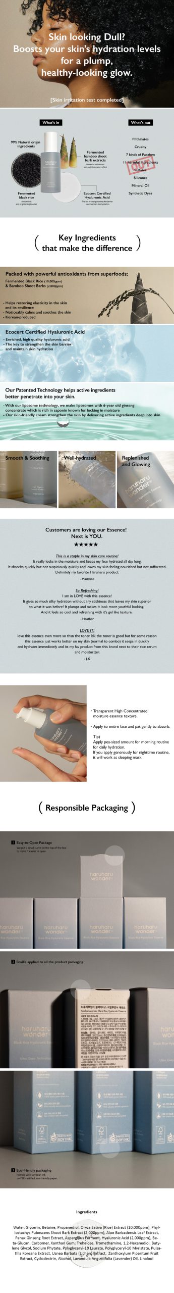 Water, Glycerin, Betaine, Propanediol, Oryza Sativa (Rice) Extract(10, 000ppm), Phyllostachys Pubescens Shoot Bark Extract (2, Aloe Barbadensis Leaf Extract, Panax Ginseng Root Extract, Aspergillus Ferment, Hyaluronic Acid (2, Beta-Glucan, Carbomer, Xanthan Gum, Trehalose, Tromethamine, 1,2-Hexanediol, Butylene Glycol, Sodium Phytate, Polyglyceryl-10 Laurate, Polyglyceryl-10 Myristate, Pulsatilla Koreana Extract, Usnea Barbata (Lichen) Extract, Zanthoxylum Piperitum Fruit Extract, Cyclodextrin, Ethanol, Lavandula Angustifolia (Lavender) Oil, Linalool (*Natural essence oil and ingredients included)