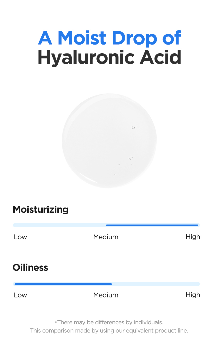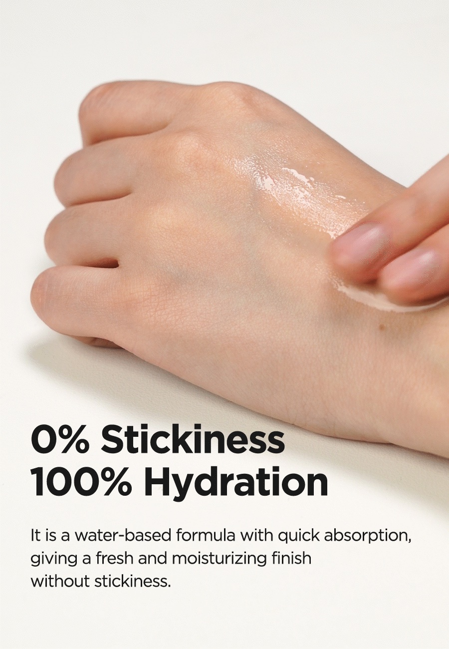 Its thin water based formula moisturizes skin. And it doesn’t have slippery and stickiness feeling, which is known as the characteristic of Hyaluronic Acid.