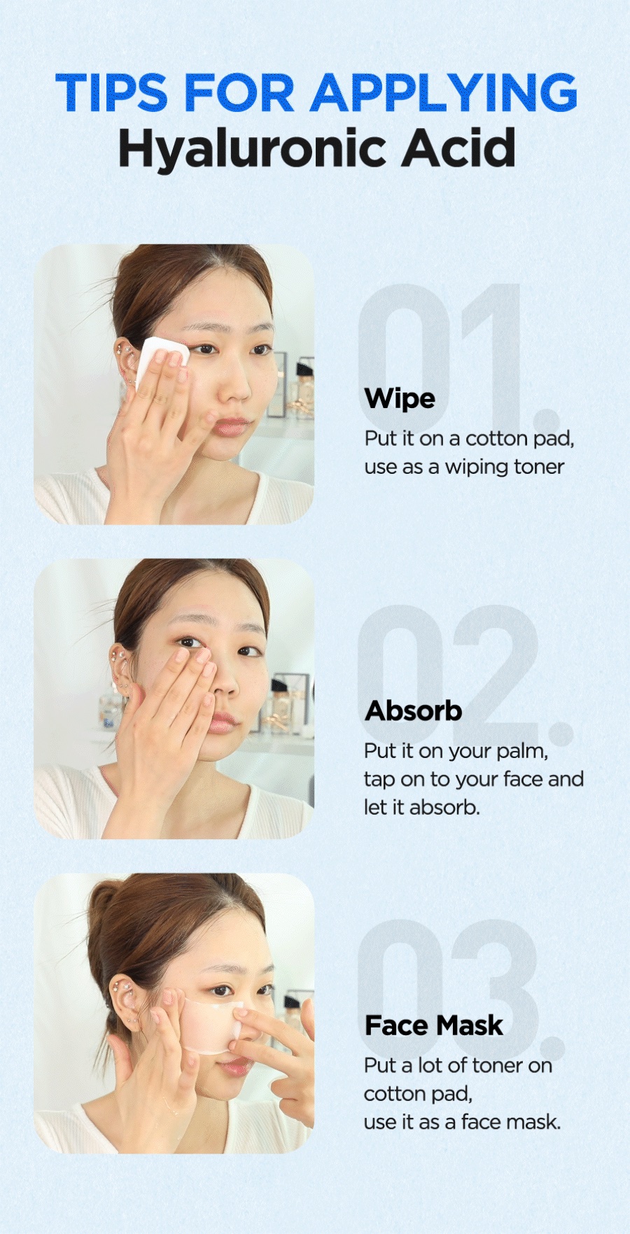 After washing face, apply it with your hands or cotton pad. Pat lightly for better absorption.