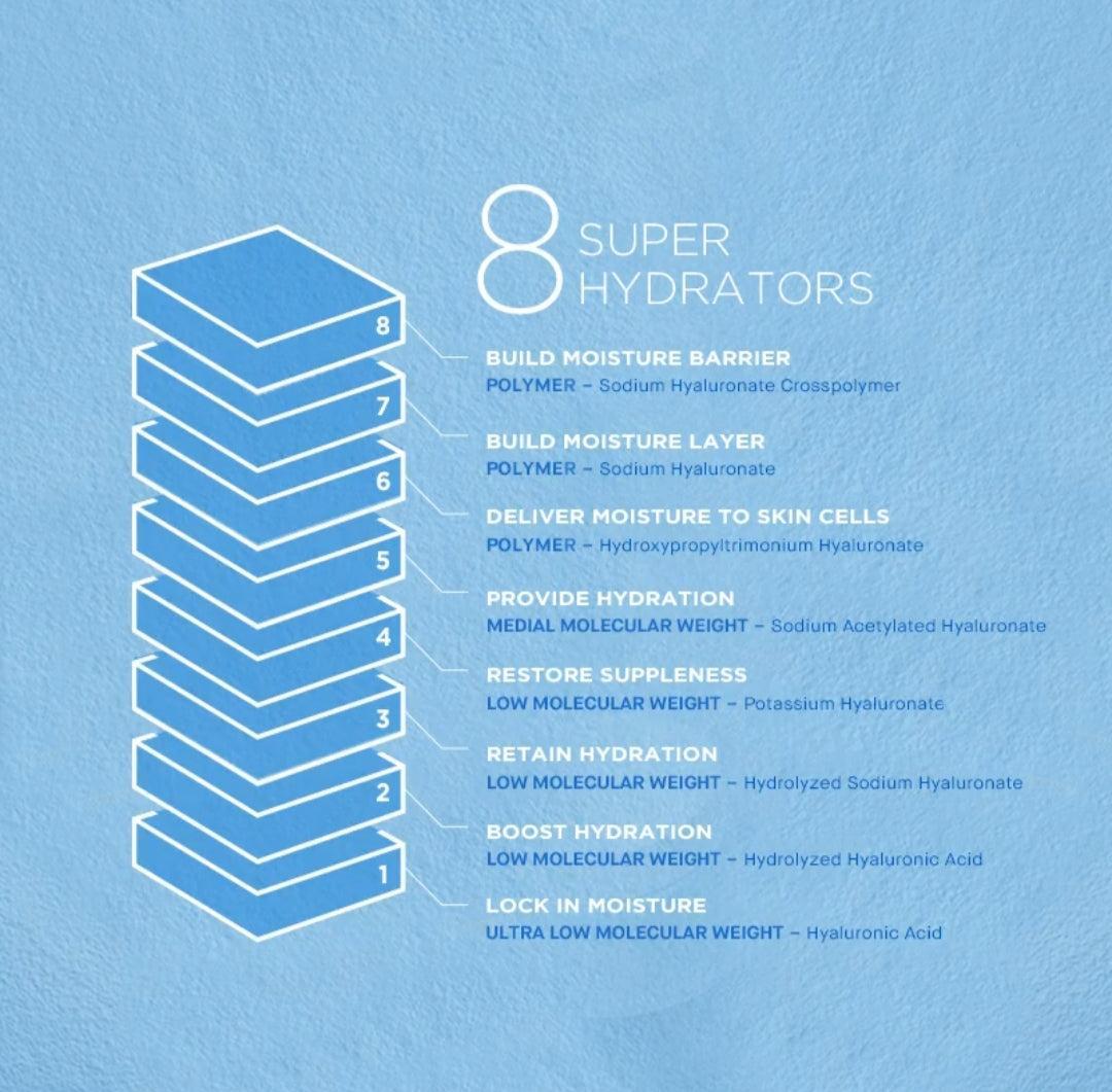 KEY INGREDIENTS-8 Multi-weighted forms of Hyaluronic Acids: Fills in and locks in moisture-Panthenol: Moisturizes and gives skin radiance
