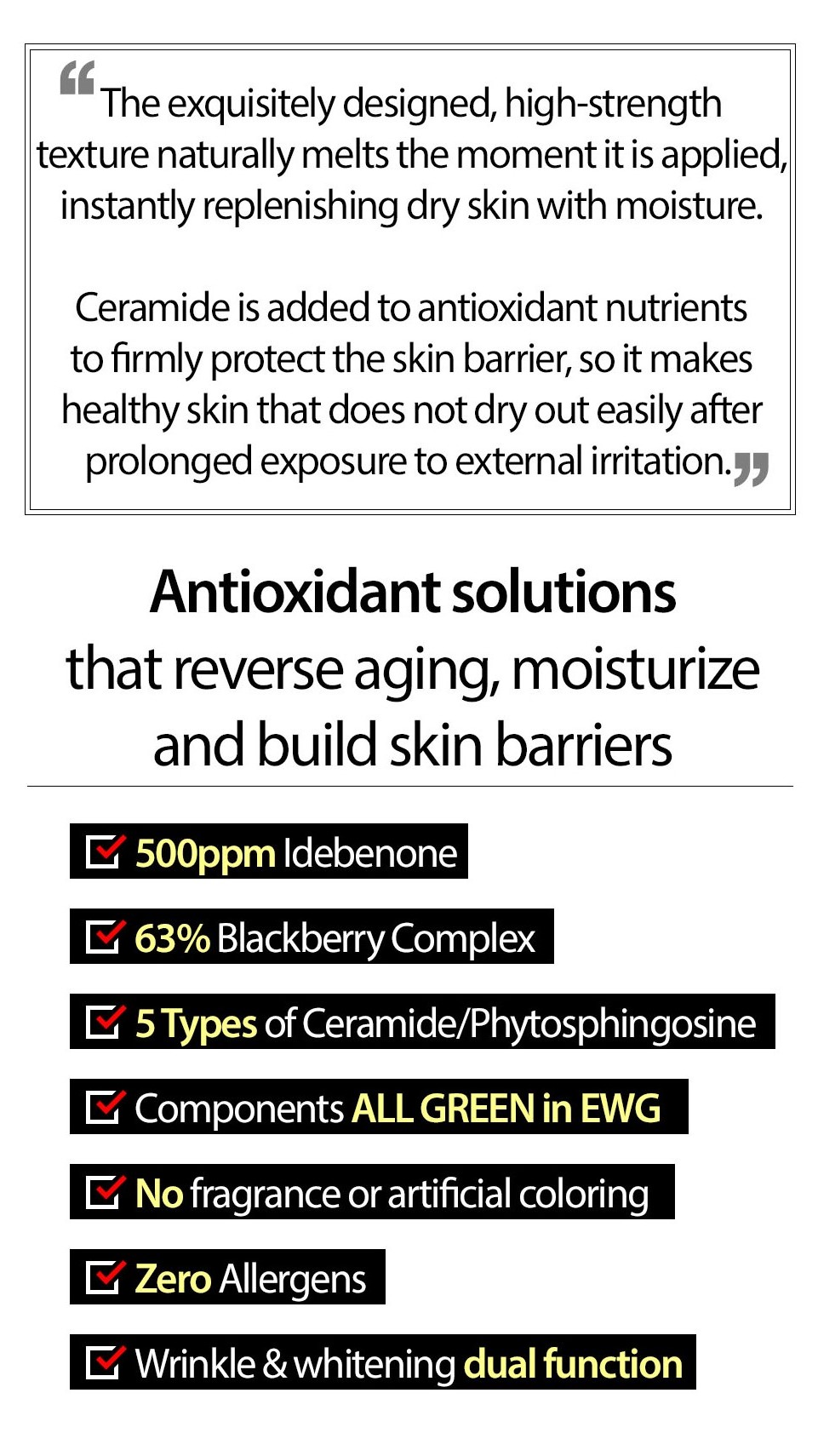 Contains 5 kinds of Ceramides and Phytosphingosine to create strong skin moisture barrier and prevent natural water loss.