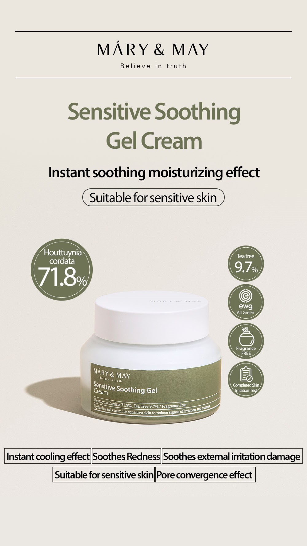 Mary&May Sensitive Soothing Gel Blemish Cream, 71.8% Houttuynia Cordata + 9.7% Tea tree extract, translucent gel type cream to soothe troubled and sensitive skin 2.46 fl oz