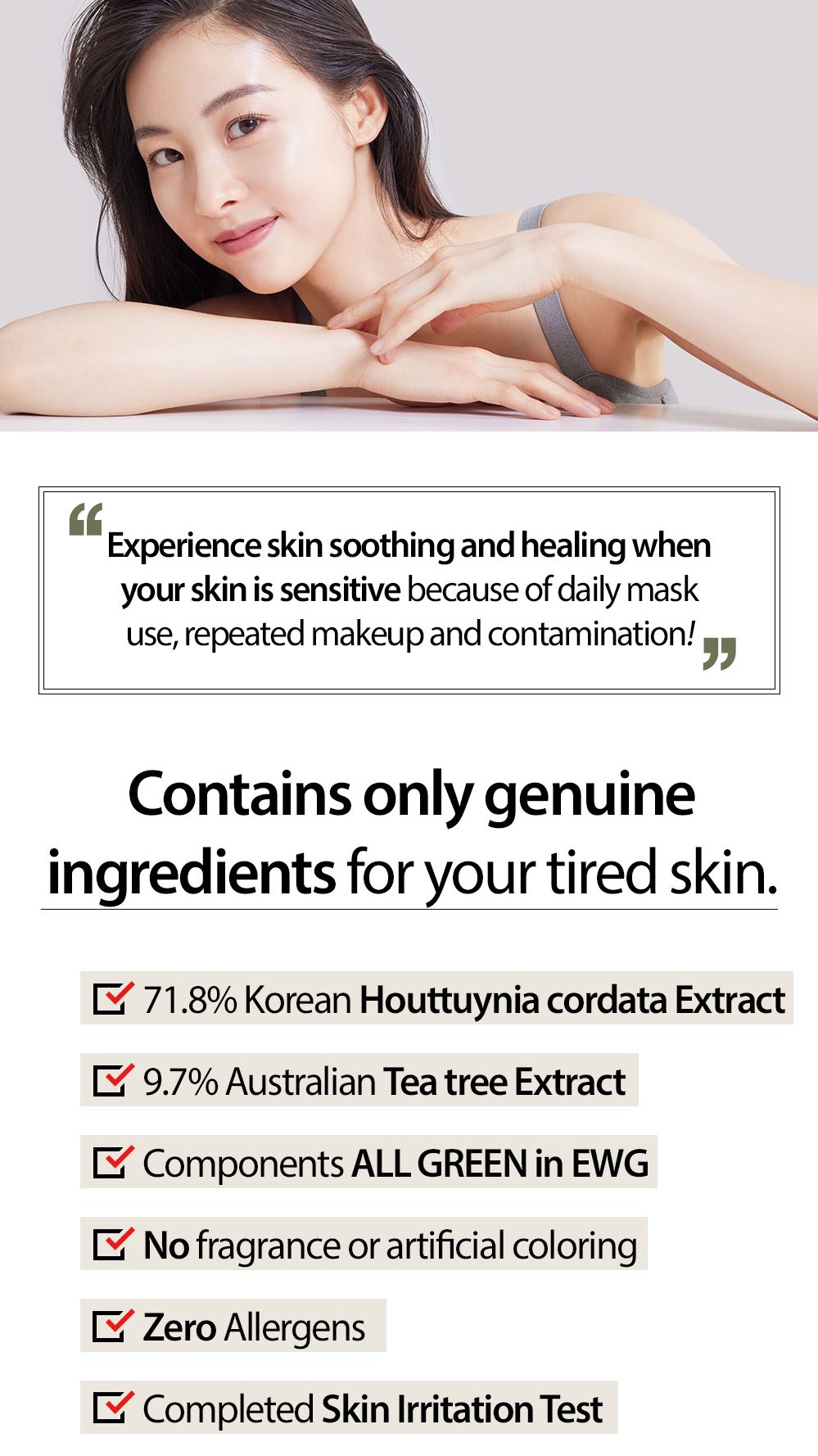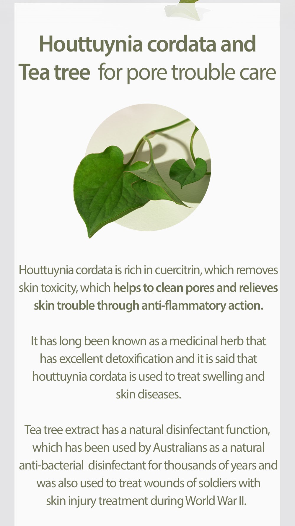 Enriched with 71.8% Houttuynia Cordata Extract that has anti-inflammatory property to soothe troubled skin while refines the appearance of pores.