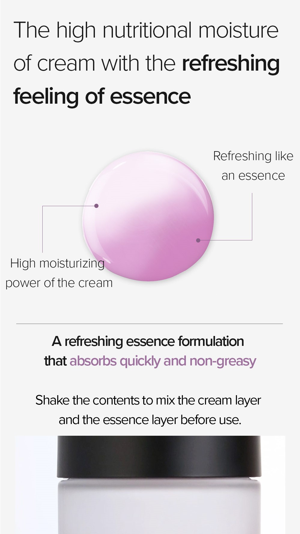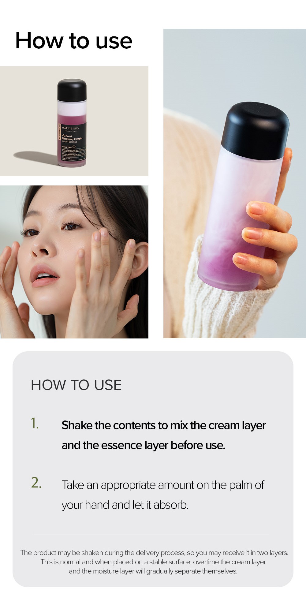 1. Shake the contents to mix the cream layer and the essence layer before use.