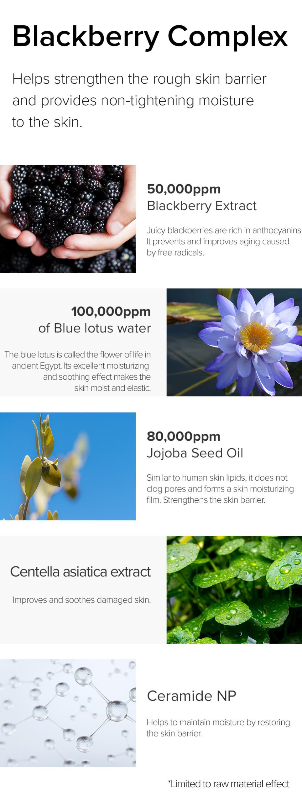 With 100,000ppm blue lotus water, moisturizing and soothing effects, it provides moist and elastic skin.