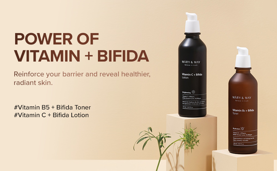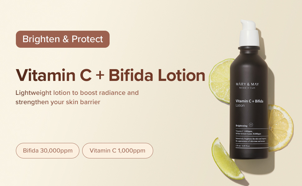 Mary&May Vitamin C + Bifida Lotion, 30,000ppm Bifida fermentation with 1,000ppm Vitamin C to brighten dull skin and moisturization 4.05 fl oz