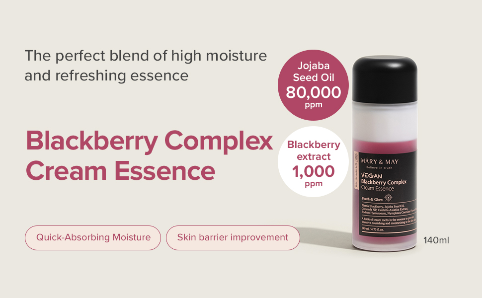 Mary&May Vegan Blackberry Complex Cream Essence contains nutritious cream in a refreshing essence and balances the oil and moisture balance of the cream with refreshing use of essence.