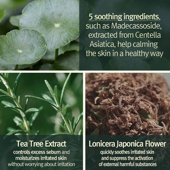 Purified Water, Dipropylene Glycol, Disodium Laureth Sulfosuccinate, Disodium Cocoyl Glutamate, Coco-Glucoside, Polyglyceryl-10 Myristate, Camellia Japonica Flower Extract, Centella Asiatica Extract, Sodium Hyaluronate, Lonicera Japonica (Honeysuckle) Flower Extract, Melaleuca Alternifolia (Tea Tree) Leaf Extract, Salvia Officinalis Leaf Extract, Caprylic/Capric Triglyceride, Cetyl Ethylhexanoate, Ethylhexyl Palmitate, Hydrolyzed Hyaluronic Acid, Hydroxypropyltrimonium Hyaluronate, Sodium Hyaluronate Crosspolymer, Sodium Acetylated Hyaluronate, Madecassoside, Madecassic Acid, Asiaticoside, Asiatic Acid, Butylene Glycol, Citric Acid, Caprylyl Glycol, Hydroxyacetophenone, Morinda Citrifolia Seed Oil, Salix Alba Bark Extract, Polyquaternium-67, Propanediol, Ethylhexylglycerin, Disodium EDTA, 1,2-Hexanediol