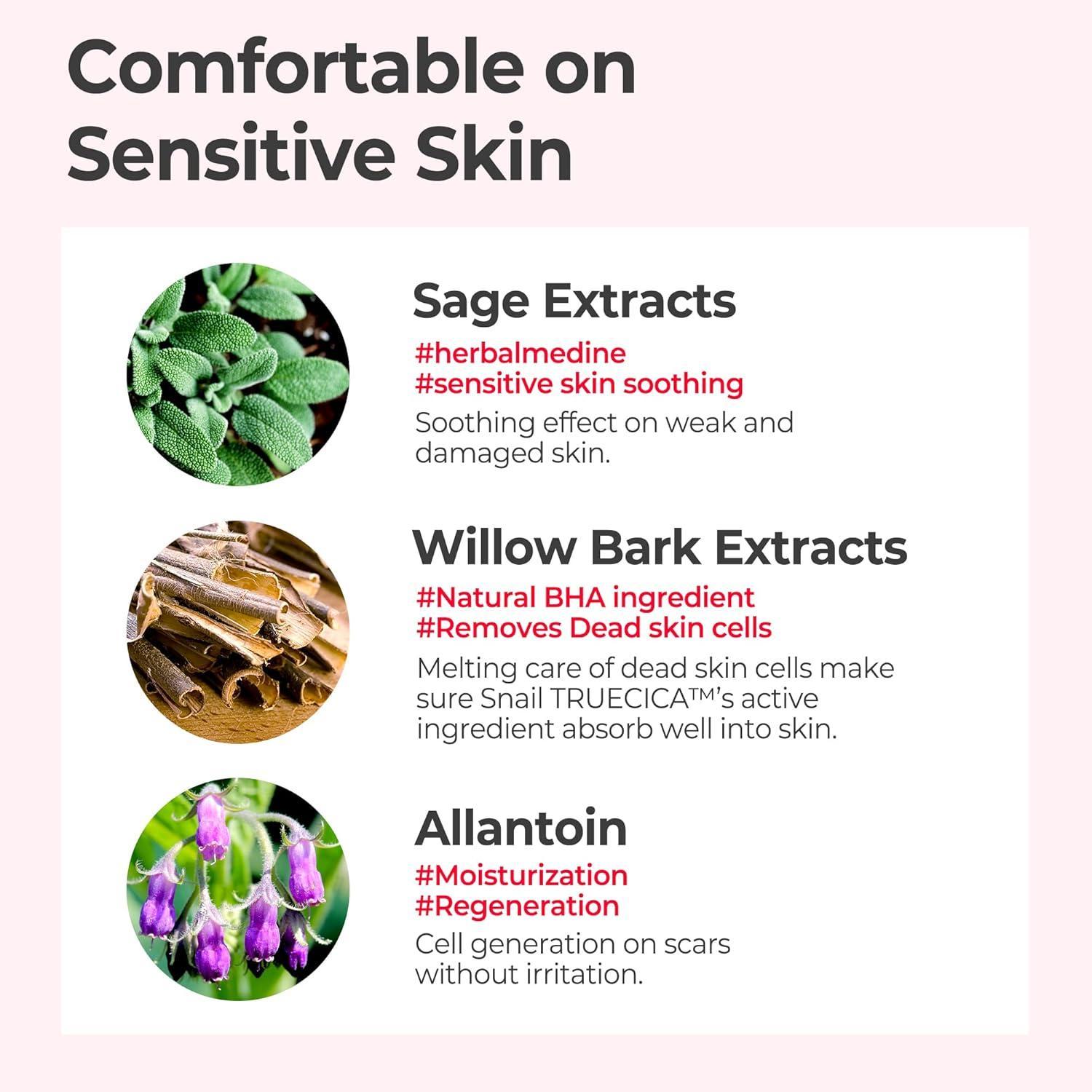 Water, Butylene Glycol, Niacinamide, 1,2-Hexanediol, Snail Secretion Filtrate, C12-14 Pareth-12, C12-14 Pareth-7, Carbomer, Tromethamine, Dioscorea Japonica Root Extract, Trehalose, Ethylhexylglycerin, Beta-Glucan, Hydrolyzed Corn Starch, Citrus Aurantium Bergamia (Bergamot) Fruit Oil, Allantoin, Adenosine, Disodium EDTA, Sucrose, Melaleuca Alternifolia (Tea Tree) Leaf Extract, Glycyrrhiza Glabra (Licorice) Root Extract, Agrimonia Eupatoria Extract, Salvia Officinalis (Sage) Oil, Centella Asiatica (Gotu Kola) Extract, Salvia Officinalis (Sage) Leaf Extract, Camellia Sinensis (Green Tea) Leaf Extract, Chamaecyparis Obtusa Leaf Extract, Silybum Marianum Seed Extract, Perilla Frutescens Leaf Extract, Sodium Chondroitin Sulfate, Broussonetia Kazinoki Root Extract, Propolis Extract, Artemisia Capillaris Extract, Cimicifuga Dahurica Root Extract, Salix Alba (Willow) Bark Extract, Pentylene Glycol, Madecassoside, Oenothera Biennis (Evening Primrose) Flower Extract, Asiaticoside, Asiatic Acid, Madecassic Acid, Phenoxyethanol