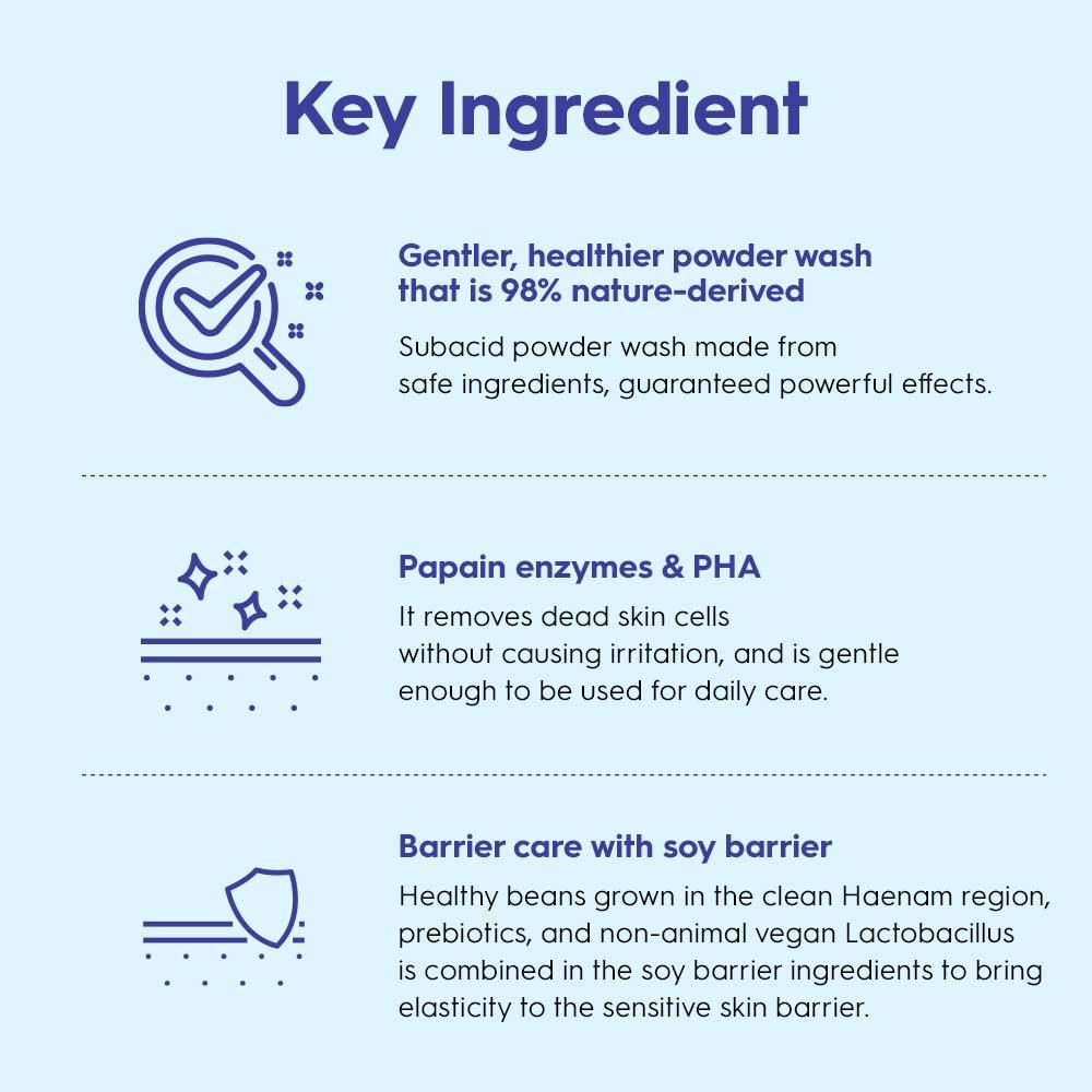 The powder wash also contains vegan lactobacillus from Haenam, Korea to strengthen sensitive skin.